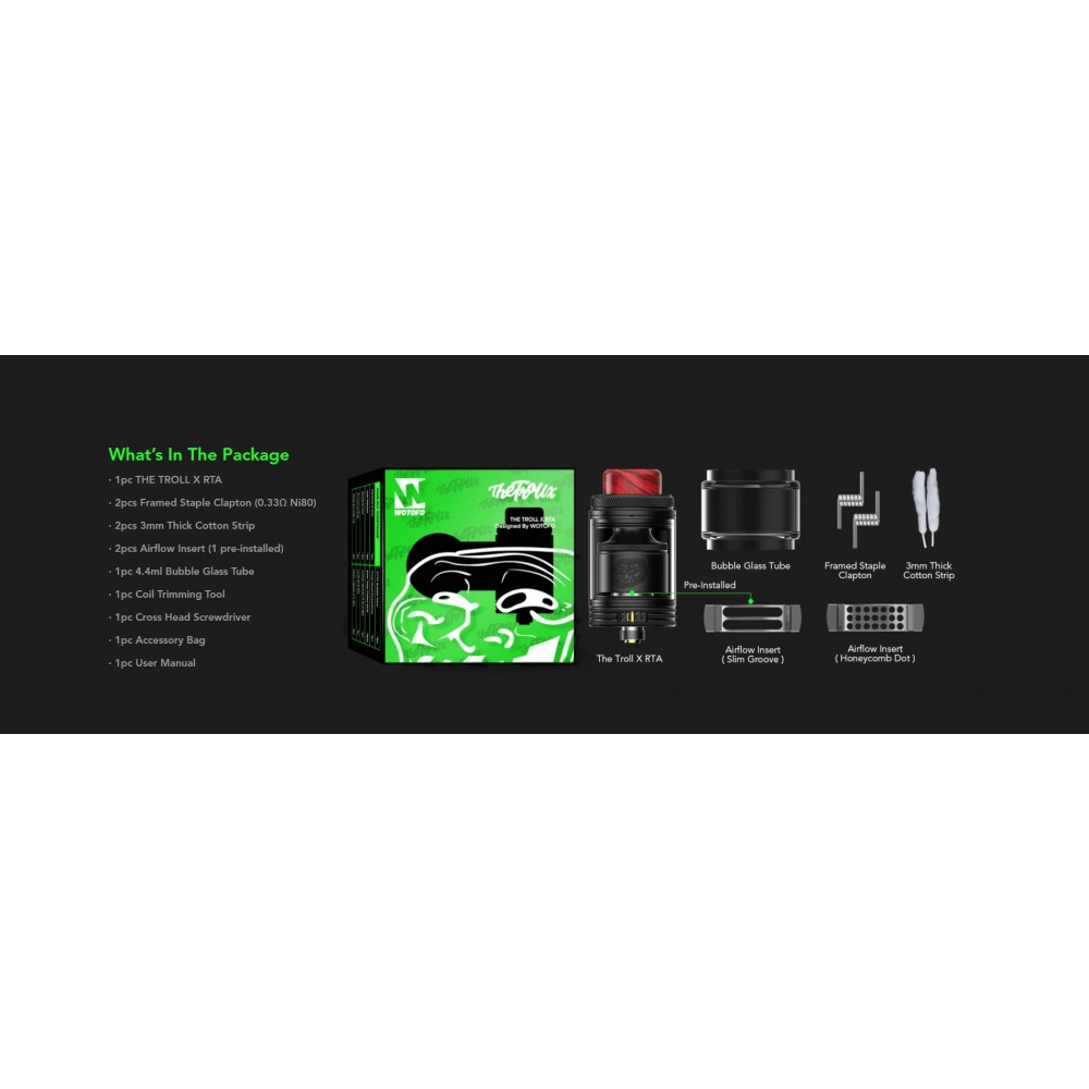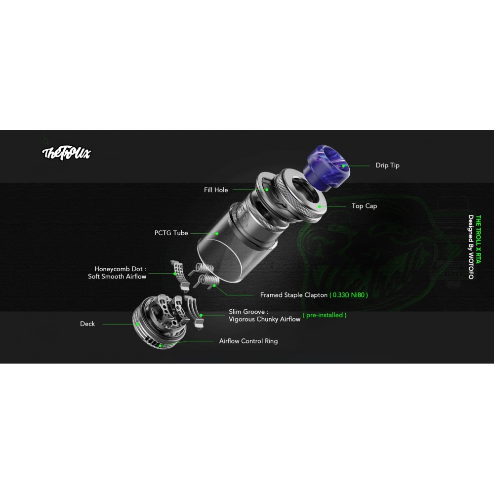 One of the strongest names in evaporation is back! The Troll X RTA from Wotofo. The taste performance is spectacular! After all, its name says it all, as the "X" indicates that the taste it gives is 10 times better than the previous version. It consists of a few pieces, which makes it simple to disassemble. It has many air options, it will surely satisfy even the most demanding. It can accept single or double resistors and is very easy to place the cotton.
